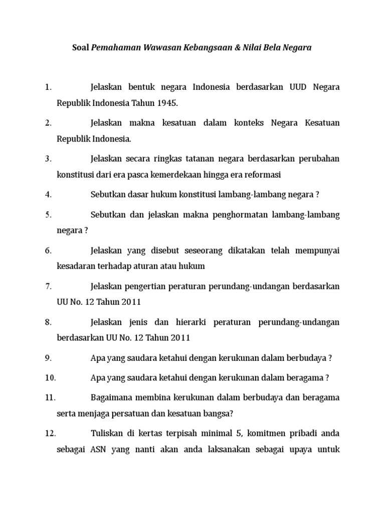 Berisi soal soal mengenai wawasan kebangsaan dan bela negara pada pelatihan dasar cpns angkatan i kementerian sekretariat negara. Bekerja sebagai pegawai negeri sipil (pns) di pkp2a ii lembaga administrasi negara ri. Latikan soal pkn kelas 9. Sikap dan perilaku warga negara yang dijiwai. Kesadaran bela negara itu hakikatnya kesediaan berbakti pada negara dan kesediaan berkorban membela negara.